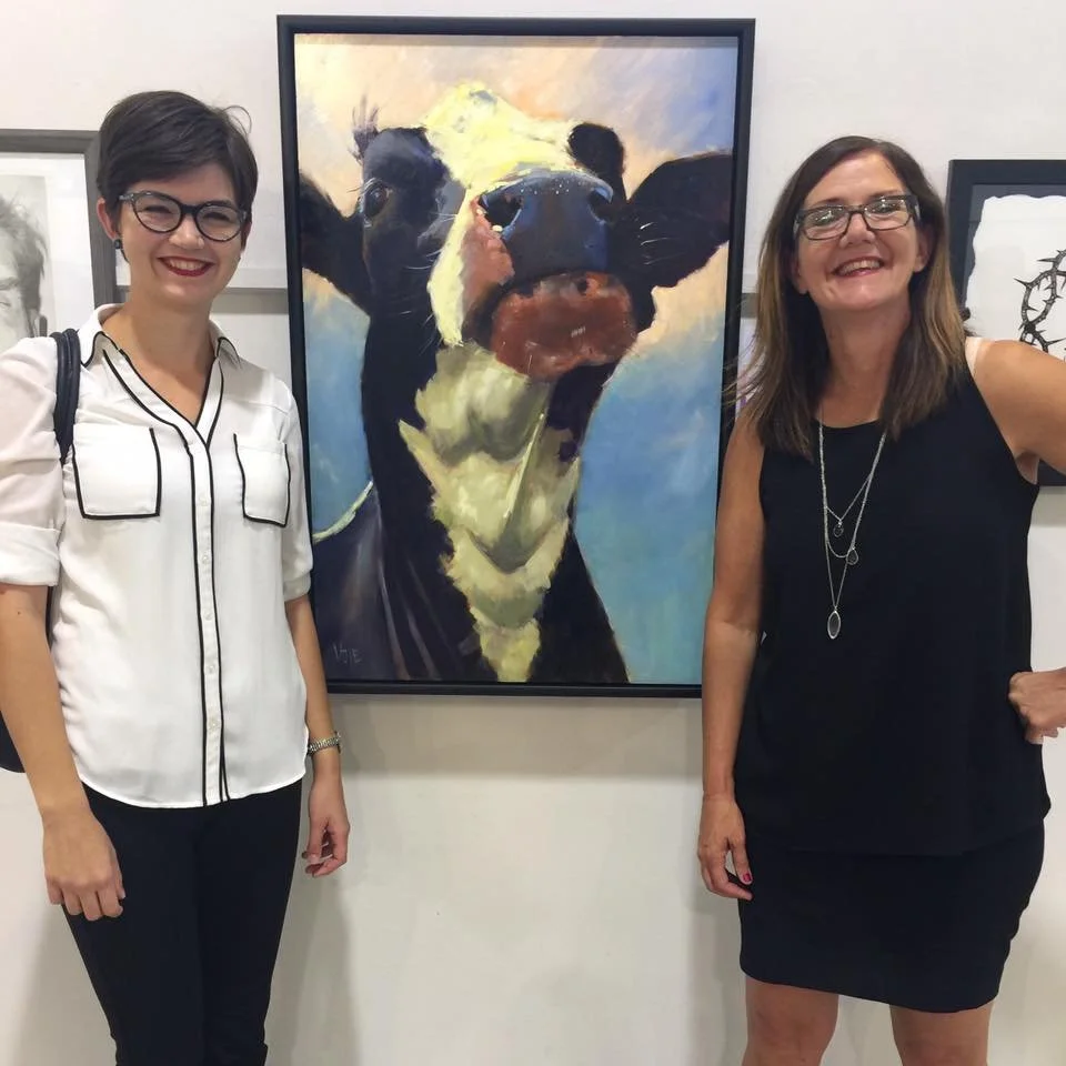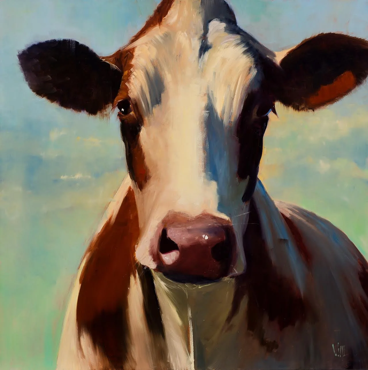A: I don’t know! I didn’t grow up with cows, I never lived on a farm—I mean, I lived on a 10-acre hobby farm where we had a couple of pigs. My sister had horses which I hated—I’ve never painted a horse because I think they’re just, like, too beautiful. I had pigs, I had sheep, I had pigeons. I had one chicken. But I never had a cow. And I don’t know, it’s something about—who doesn’t like a pasture filled with cows? I always have to stop and look at them. I think because they have such a weird bone structure and they’re so misshapen, they’re kind of easier to paint because they’re kind of flawed-looking animals to start with. They don’t have the majestic lines of a horse at all. They have all these extra stomachs and weird bones in their faces, and their hip bones are very weird looking. I love how their underbellies just reflect the green grass underneath.