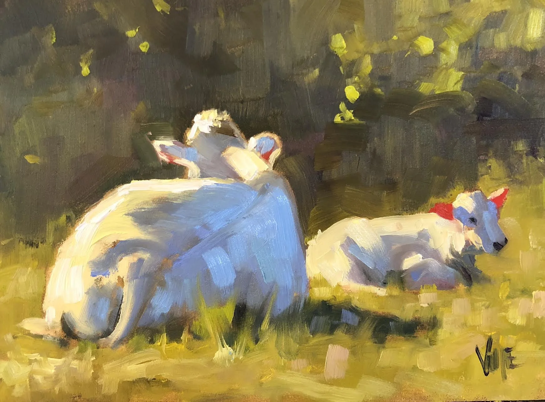 A: I do three kinds of painting. I paint on location outside, from still life in my house—including a lot of paintings of my pets—and from photos. I paint from my own photos (unless it’s a pet portrait commission), and I’m not a photorealist by any means. Sometimes I have commissions to do, so then it’s pretty basic, like, you know what you’re going to paint that day. With non-commission work, I try to keep it to what I want to paint. I’ve been trying to paint flowers in my studio for spring, so I’ll go buy fresh flowers on Sundays and have flowers to paint during the week. Or sometimes I just want to do buildings one week or I want to do more cows or pigs. If I’m going to paint from photos, before I go to bed the night before, I’ll know what I’m going to paint the next day. The more decisions you don’t have to make that day, the easier it will be to go paint. So, I try to know exactly what I’m going to paint—and then when I get into the studio I almost always change my mind at the last minute and decide this is not doing it for me, I want to do something else, and then I usually do something else. But at least I had a reason to get into the studio! With art, the hardest part is just getting yourself to show up. So, the easier you can make it for yourself to show up, the better—which is why daily is good because it becomes a habit. Otherwise you never carve time out.