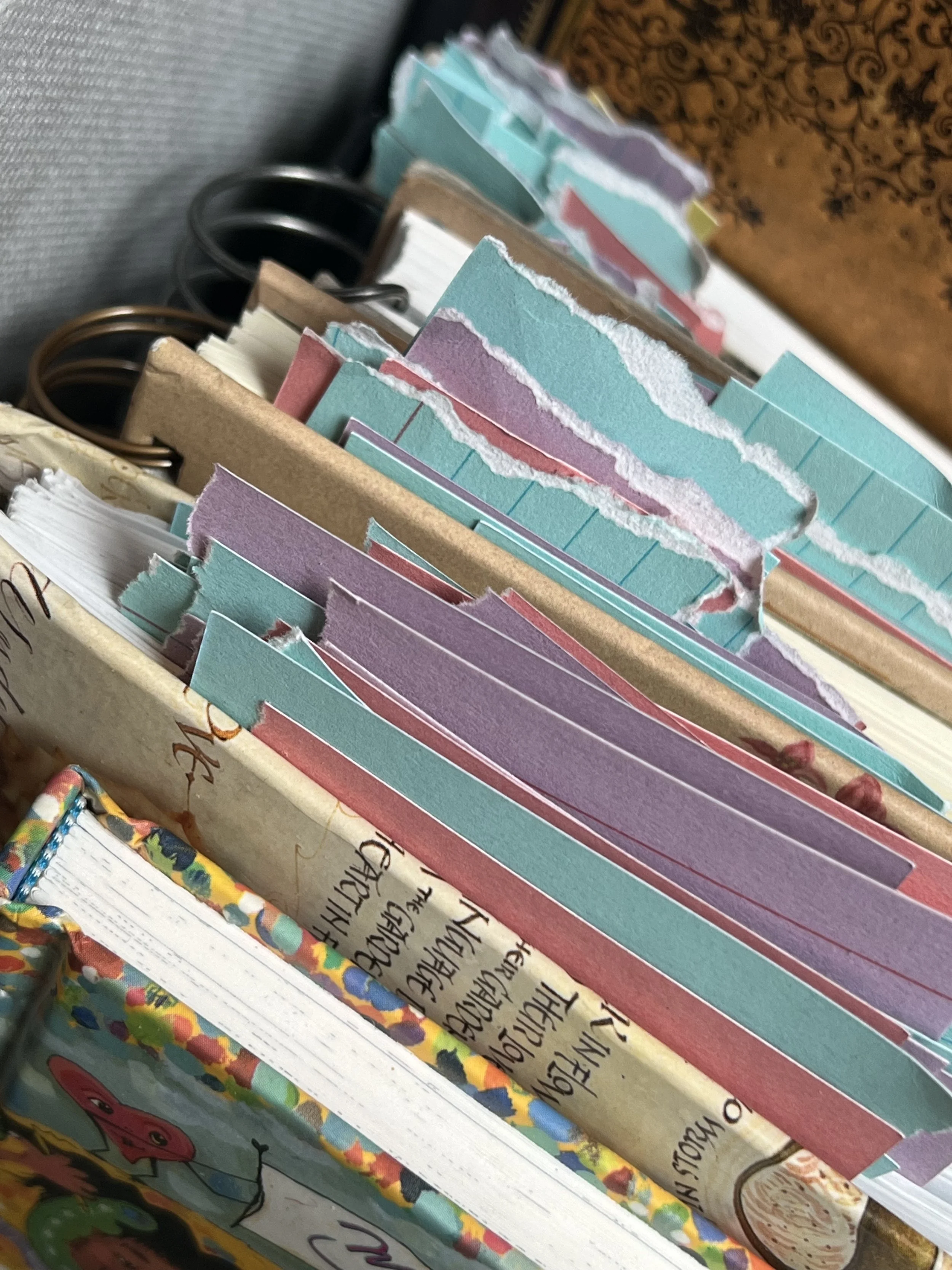 A peek into my memoir research process: childhood diaries. Blue cards mark writing about piano dreams, pink cards mark writing about writing dreams, and purple cards mark all the little girl life insights that just make me want to hug her.
